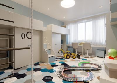 Dětský pokojíček pro dva raubíře. Jako podlahu jsme použili teplý koberec, na kterém si děti budou moci hrát. Postele jsme vyvýšili a pod ně jsme vymysleli úložný prostor. Stoly pro malování a budoucí studia jsou hezky pod oknem, kde mají ty nejlepší světelné podmínky. Dále je zde stěna se skříněmi, kde se mohou umístit hračky a knížky či hry.