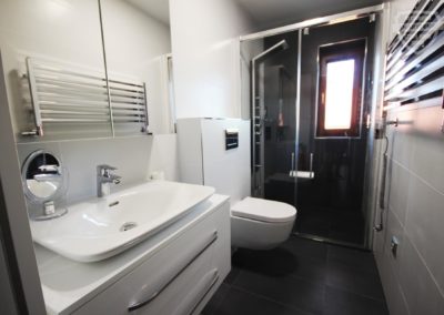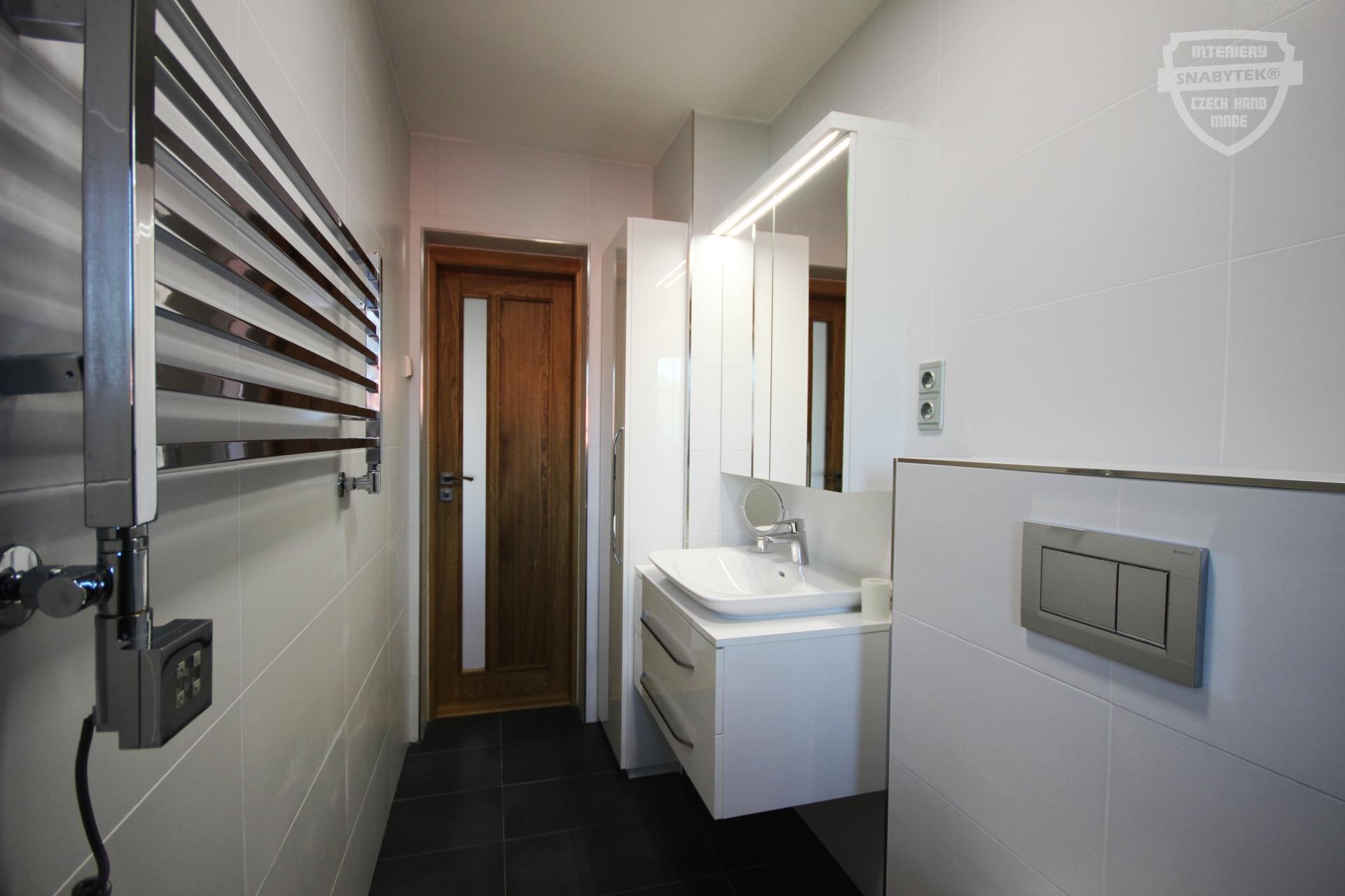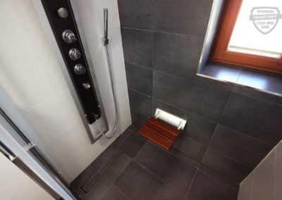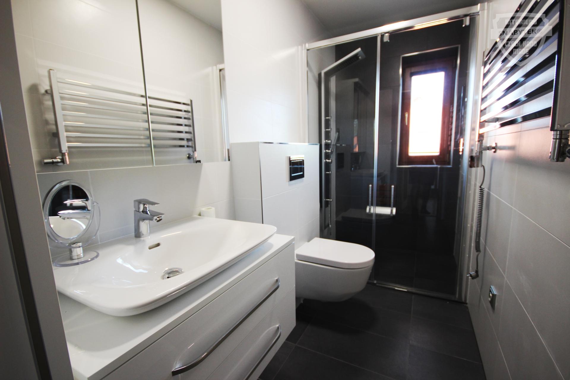 Důkaz místo slibů. I z malého dobývacího prostoru jde vytěžit maximum. Ukázka realizace koupelny, která byla řešena ve velmi úzkém prostoru. Obklady značky RAKO, skleněný sprchový kout SANSWISS s posuvnými dveřmi, termo sprchový a masážní panel, sedátko do sprchového koutu, podlahové topení a otopný žebřík s možností vytápění i na elektřinu. Závěsný modul značky GEBERIT. Nábytek samozřejmě z naší stolárny SNABYTEK®.