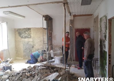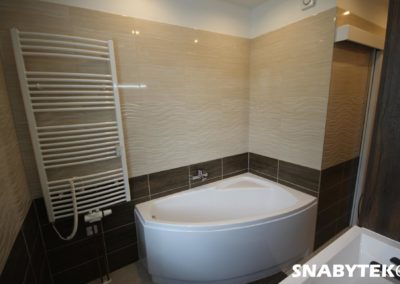 Byt, který se rekonstruoval, byl původně dispozičně řešen celkem nešťastně… při vstupu byl hned vpravo za dveřmi wc dále mini koupelna… následovala chodba vlevo pokojík, dále vlevo obývák a na konci vpravo ložnice, před ložnicí vpravo vedle koupelny byla jídelna z jídelny se procházelo do mini kuchyně, která byla defakto za jádrem… Když k nám klienti přišli, požadovali drobné změny v rámci rekonstrukce koupelny a renovaci kuchyně. Když jsme na místo s designérem přijeli a prostory zaměřili začali jsme se nad budoucím designem přemýšlet a vymysleli jsme úžasné nové dispoziční řešení. Které jsme představili klientům… co následovalo? Wooow… no…. toto jsme nečekali… woow.. no takto jsme nad tím nikdy nepřemýšleli… chvilku nám to klienti rozdýchávali… ale poté kývli… a to je přesně ten důvod, proč nás tato práce baví… Přicházíme s řešeními, které by Vás ani ve snu nenapadla. S řešením komplexní rekonstrukce, kdy se prostě sbalíte a jedete pryč a starosti necháte na nás…. S řešením které zvětší klientům koupelnu tak, že se do ní vleze prostorná rohová vana, pračka, umývadlo, žebřík i nábytek. A teď už konkrétně, Obklady jsme použili v barvách hnědé a béžové s dynamickou vlnkou, která celý prostor hezky zútulní. Zároveň nabídne paní, která velmi ráda vaří úžasnou prostornou kuchyni, ve které bude mít i jídelní stůl, u kterého se ráda setkává se svou rodinou. Dokonce televizi na kterou se ráda dívá při vaření. Moderní vestavěné spotřebiče lednici, troubu, mikrovlnku, myčku se povedlo zakomponovat tak, že vznikla obrovská pracovní plocha. Dřez je situován kousek od okna ze kterého je hezký výhled. Pan domácí měl ve starém bytě velké akvárium a zjistili jsme, že je to velké hobby. Díky našemu projektu www.designakvaria.cz nás ihned napadlo, že do kuchyně zakomponujeme akvárium. (Na těchto fotografiích ještě není nainstalováno, prostor je připraven.. fotky budou přidány později). Vznikl tak prostor pro WOW 2m akvárium, které bude úžasnou dominantou. Dalším požadavkem klienta byl obkladový kámen… a ten jsme použili jako krásný prvek do otevřené chodby. Všimněte si zabudovaných led světel v soklu, která jsou spouštěna pohybovým čidlem. V noci vás tak doprovodí do koupelny, bez toho aniž by jste museli rožnout velké osvětlení. V zádveří je dále odkládací stěna zapuštěná v nice a velký botník. Dále pak zrcadlo.. Ložnici, kterou jsme nijak stavebně dispozičně nenarušili jsme vymysleli tak že jsme postel zapustili do skříně, která pojme opravdu velké množství oblečení. zároveň je zde řešeno osvětlení tak, že si každý z páru může rožnout svoji bodovku nad nočním stolkem a komfortně pak vypínače umožní rožnout nebo zhasnout centrální osvětlení z postele. Dveře v interiéru jsme dodali značky DRE, které patří k naší velmi oblíbené značce. Kombinace otevíravých a posuvných dveří skvěle padla do tohoto dispozičního řešení. Zpracováním a designem jsou nadčasovým řešením. A to nejlepší nakonec, podlahy z vinylu v provedení TOPSILENCE, extra tichá a zateplená vinylová podlaha značky GERFLOR…. Nu a je na místě se zmínit, že celou stavbu jako vždy jsme režírovali pomocí našich šikovných parťáků zedníků, obkládače, elektrikáře, vodáře, sadrokartonáře, podlaháře a partou truhlářů z naší výroby.. Logisticky je to velmi náročný úkol… ale jsme tady SNABYTEK® již 23 let a za tu dobu máme bohaté zkušenosti, které rádi využíváme a úročíme při práci… Díky kolektivní práci a dokonalé koordinaci jsme docílili, že jsme dali vzniknout této krásné realizaci a i díky Vám našim fanouškům, přátelům, zákazníkům kteří nás stále ženete v před! Děkujeme, že jste…